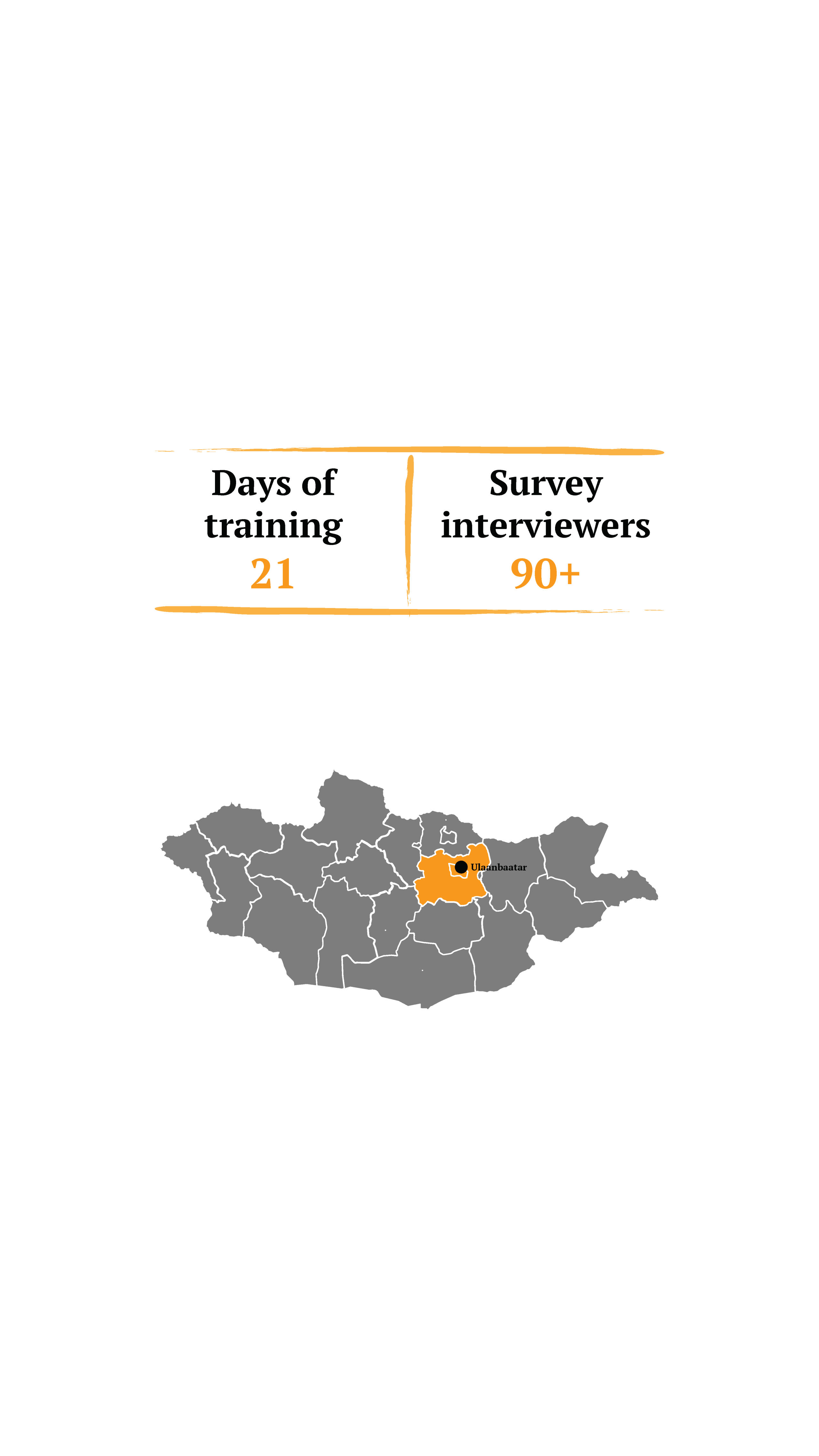 Fieldwork for the quantitative component was completed during May-June 2017 using tablets to collect the data. This allowed for the data to be accurately recorded and then uploaded daily to the National Statistics Office in Ulaanbaatar.