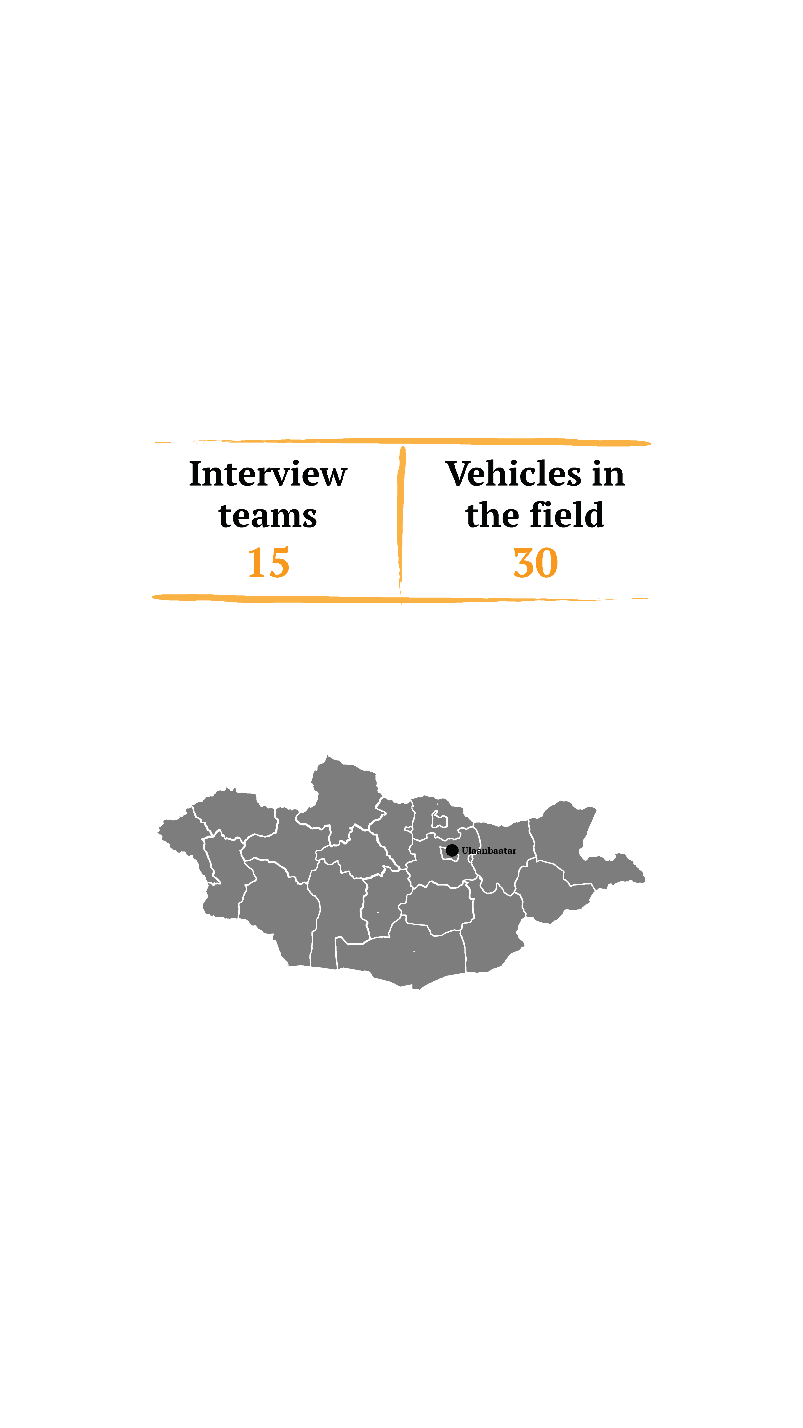 With a country as vast as Mongolia, the National Statistics Office faced many challenges. The survey took place in the summer months, but the unpredictable weather patterns still took a toll. Teams were pitted against the beautiful but harsh Mongolian landscape. Snow, sandstorms and boggy terrain provided many logistical challenges.